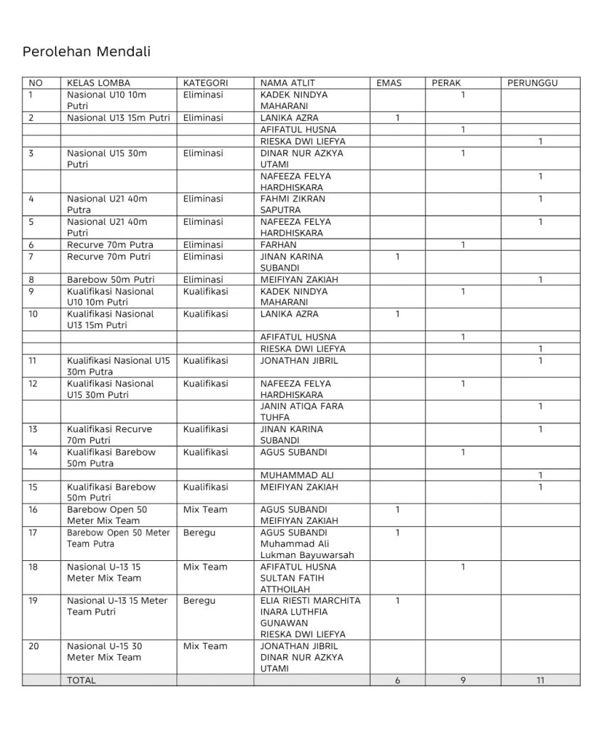 Dinar Nur Azkya Utami (Brotherhood Archery) meraih perak Nasional U-15 30 meter putri, sementara Nafeeza Felya Hardiskara (Mayung Archery) dan Meifiyan Zakiah (Komunitas Panahan Sumbawa) masing-masing menyumbang perunggu dari berbagai divisi.